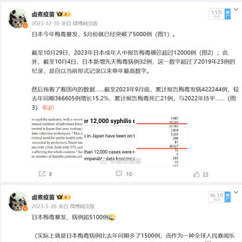 【日本梅毒爆发病例创历史新高,有疫苗可以预防吗?】经常关注梅毒消息的网友应该比较了解,我国梅毒的历史深度和发病数都能“秒杀”日本。